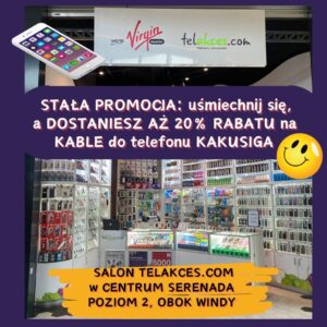 W sierpniu 2014 roku Telakces.com podpisał strategiczną umowę z Virgin Mobile i stał się kluczowym partnerem tej firmy na polskim rynku. Dzięki temu, w ofercie sklepu znajdziesz również usługi telekomunikacyjne marki Virgin Mobile. W barwach Telakces.com i Virgin Mobile działają salony i wyspy sprzedażowe w galeriach handlowych. W naszej bogatej ofercie akcesoriów znajdziesz między innymi: szkła hartowane i ładowarki do telefonów, powerbanki, etui do telefonów, słuchawki i wiele wiele innych.